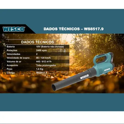 SOPRADOR DE FOLHAS A BATERIA DE 18V MODELO WS8517.9 DA WESCO