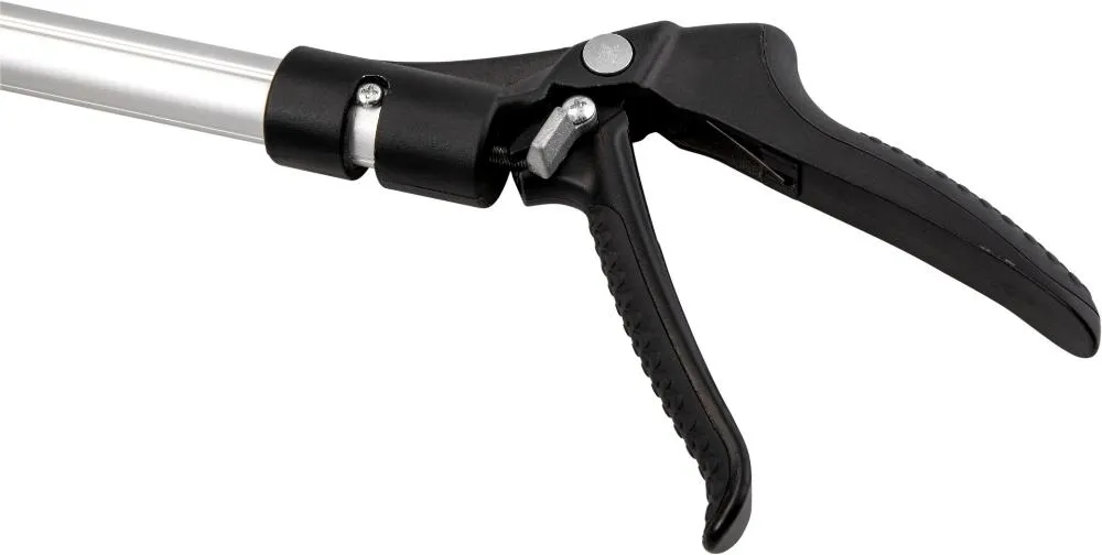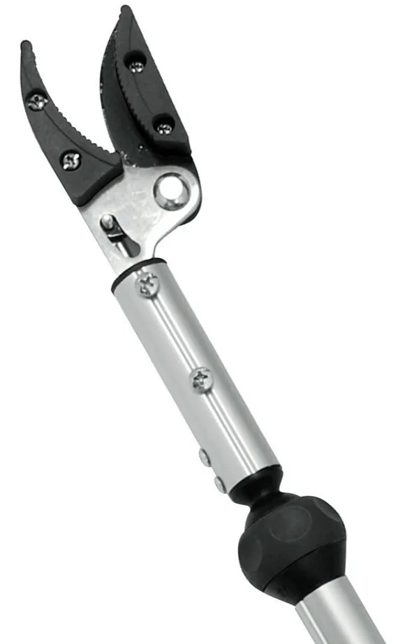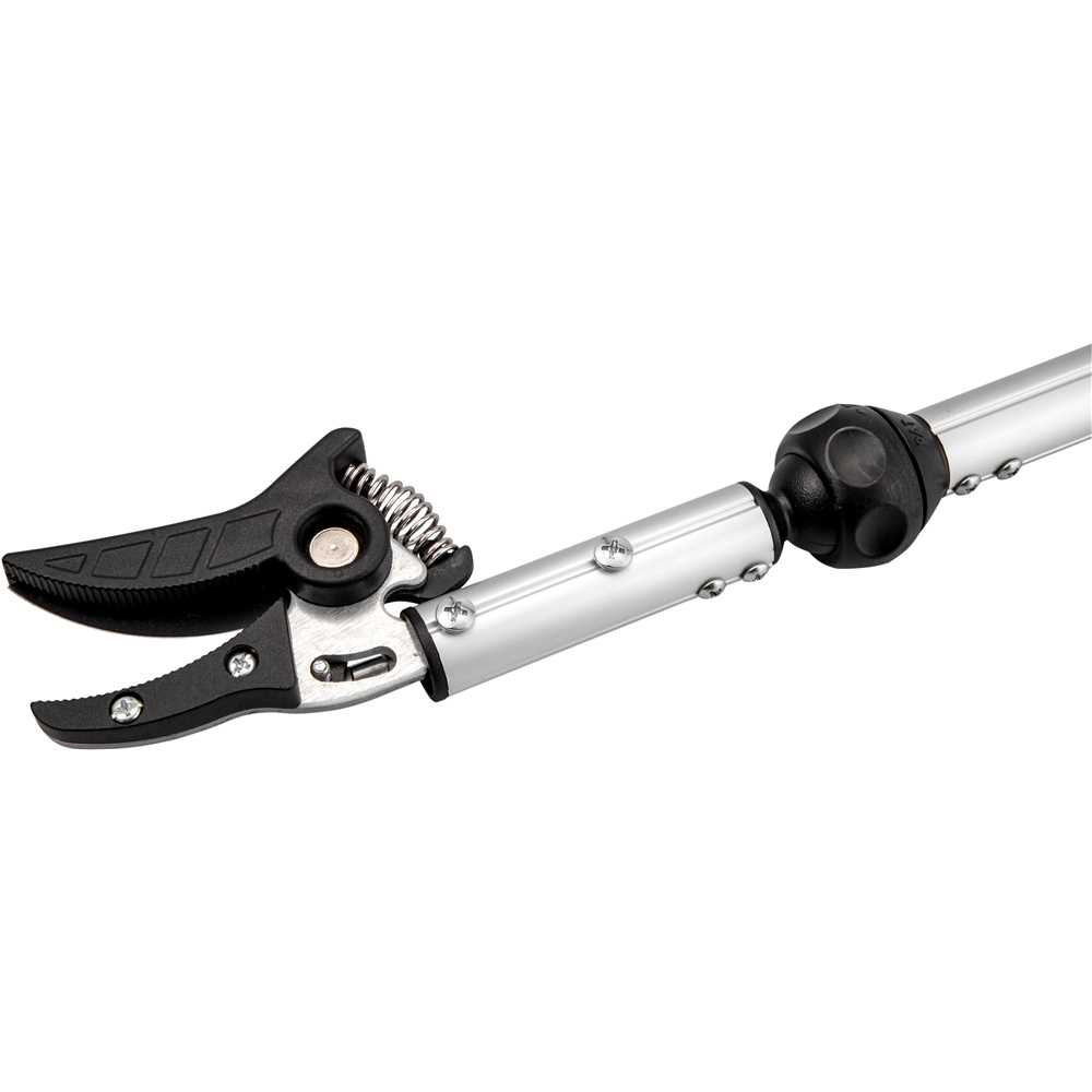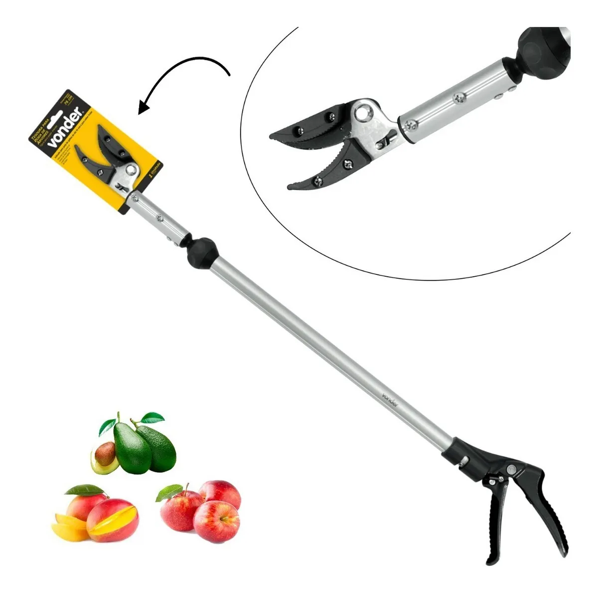 Leve, prática e de fácil manuseio. Possui gatilho com trava e sistema lateral de ajuste que permite girar o cabo em 180°. É possível também ajustar o ângulo da lâmina, facilitando ainda mais a operação. Conta com lâmina com garras de plástico que auxiliam a pega no galho a ser podado, além de evitar derrubar a fruta.