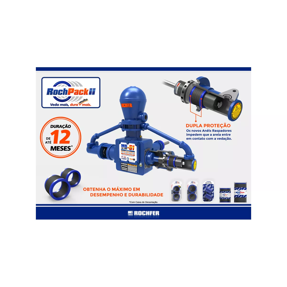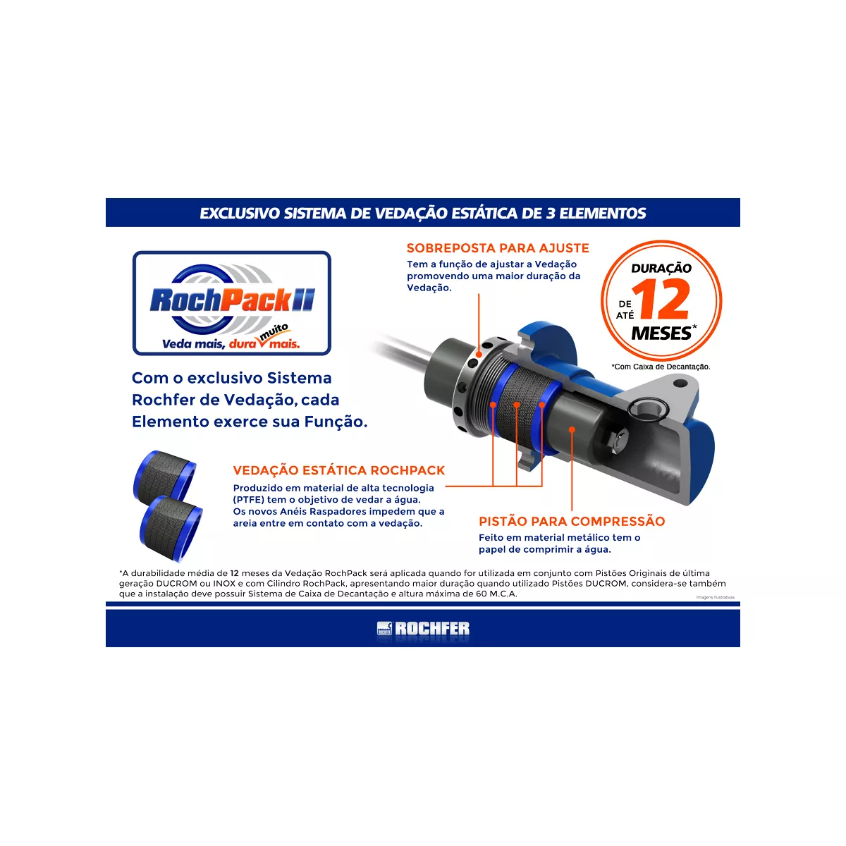 Vedação RochPack para Bombas à Roda D’água ROCHFER® Para Bombas: PB-89 / MS-89 / MSG-89 / MSG-89D A vedação RochPack® é em PTFE com grafite encapsulado, já vem cortada na medida exata de cada Pistão, possui um material de alta tecnologia com capacidade de lubrificação contínua e permanente, dispensando lubrificação externa como sebos ou glicerina. Sua durabilidade pode chegar a até 12 meses, pois através da Sobreposta, sistema esse confiável, econômico, e consagrado há mais 70 anos pela ROCHFER® é possível realizar apertos que renovam a vida útil da vedação sempre que necessário, ao invés de ter que trocar frequentemente. ATENÇÃO: A vedação RochPack® é indicada apenas para Pistões INOX ou DUCROM®.